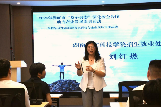 為進一步深化校企合作,助力產(chǎn)業(yè)發(fā)展,持續(xù)推動“益企興婁 ”活動,2024年7月,婁底市人力資源和社會保障局與湖南人文科 技學(xué)院聯(lián)合開辦了“婁底市首期求職能力實訓(xùn)營”。為切實提高實訓(xùn)營學(xué)員對行業(yè)企業(yè)的認知,讓學(xué)員親身感受婁底企業(yè)的發(fā)展狀況,提高學(xué)員的就業(yè)實踐能力,2024年8月7 日,由婁底市就業(yè)服務(wù)中心、湖南人文科技學(xué)院招生就業(yè)處、婁底市企業(yè)聯(lián)合會、婁底市企業(yè)家協(xié)會聯(lián)合主辦,婁底市節(jié)能環(huán)保產(chǎn)業(yè)促進中心等企業(yè)承辦,在婁星產(chǎn)業(yè)開發(fā)區(qū)產(chǎn)學(xué)研中心舉辦“2024年婁底市高校畢業(yè) 生求職能力實訓(xùn)營與企業(yè)現(xiàn)場交流活動”。湖南人文科技學(xué)院招 生就業(yè)處處長劉紅燃,婁底市就業(yè)服務(wù)中心城鄉(xiāng)就業(yè)服務(wù)部部長聶瑞成帶隊參加。