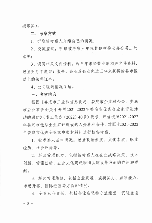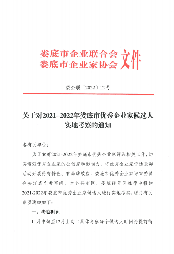 關(guān)于對2021-2022年婁底市優(yōu)秀企業(yè)家候選人實地考察的通知